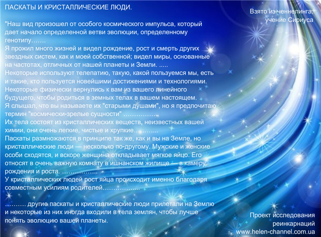 Не очень давно у меня был любопытный сеанс погружения. Клиентка очень далека от космоэнергетики, она вполне себе научный работник. В сеансе она попала на странный просмотр, с недоумением и со смехом пытаясь распаковать: что люди там женятся на роботах, и есть другие люди, которые несут яйца. Казалось бы, большего бреда не бывает… Прошло немного времени, и мне совершенно случайно в ленте выложили пост о паскатах и кристаллических людях. Это что-то совершенно немыслимое для меня, мозг брыкается, но я почитала, глаз сразу наткнулся на описание. Я чувствовала себя котенком, которого мордочкой тыкают: на, читай, не бывает?)).