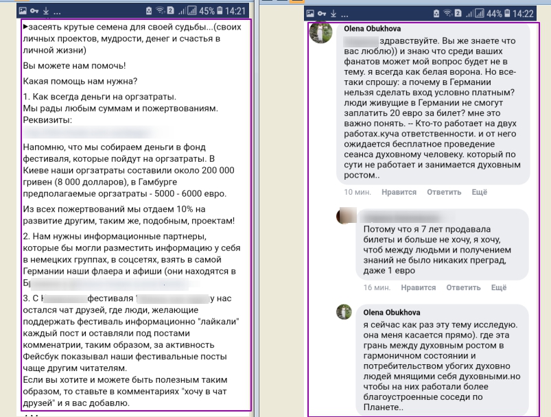 Ниже по тексту вы можете понять проблематику вопроса. Если вкратце: то жителям Украины предлагалось по желанию внести благотворительный взнос на возможность сделать духовно-эзотерический фестиваль в Германии с бесплатным входом для желающих живущих там людей.