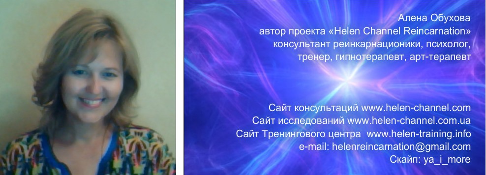 Здравствуйте, мои прекрасные читатели со всего Мира. С вами Алена Обухова, автор проекта, консультант реинкарнационики, профессиональный регрессолог, клинический (медицинский) психолог, сертифицированный арт- и сказкотерапевт, энергопрактик, ченнелер, эриксоновский и регрессионный гипнотерапевт, писательница.