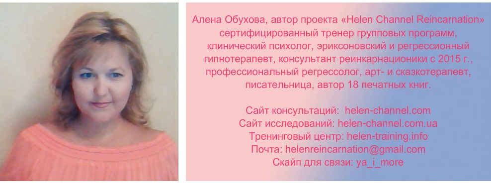 Здравствуйте, мои прекрасные читатели со всего Мира. С вами Алена Обухова, автор проекта, профессиональный реинкарнациолог, медицинский психолог, сертифицированный арт- и сказкотерапевт, эриксоновский и регрессионный гипнотерапевт, писательница.