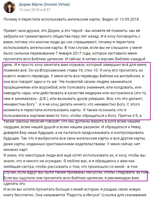 Один ее недавний пост заставил меня задуматься, почему она стала делать откат назад, в более невежественное мировоззрение, цитировать устаревшие и деструктивные писания, вместо трансляции чистых ангельских энергий.