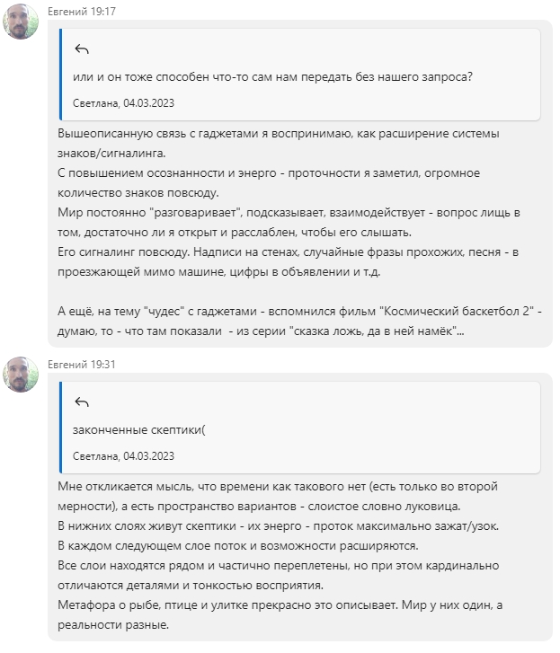 Звучит как утопия,понимаю.Просто пытаюсь и не могу объяснить себе никак логически происходящие события последней недели.Особенно когда мысленный вопрос был очень конкретизированный и меня интересовала не только информация,но и цифры и именно такой конкретный ответ и прилетел в случайной подборке через 2 минуты(сразу скажу,что на эту тему не искала информацию раннее,да и вообще никак не искала и подборка информации по подобию здесь невозможна).