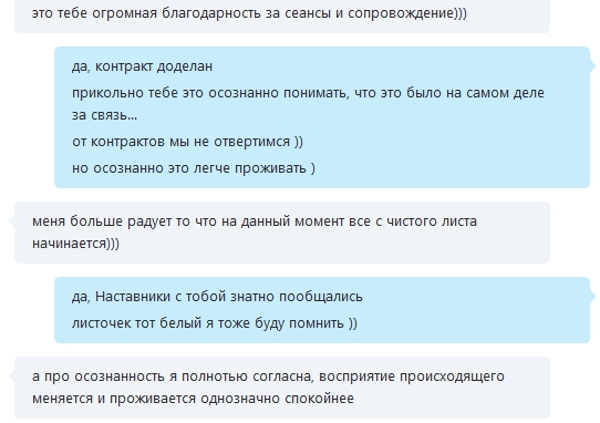 В жизни моей клиентки по прохождению этого пакета начались сдвижки от долгоиграющего затяжного кармического партнерства.Будто закрылся гештальт, и пошли внешние изменения в пространстве. Я наблюдаю, как меняется ее состояние, это очень радует.