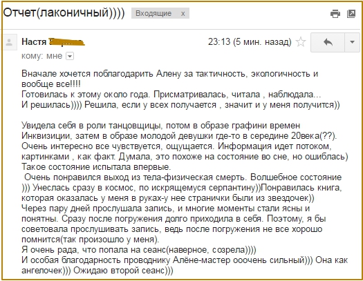 Сложно описать Духовный мир и чувства человеческим языком. Но погружения-это потрясающе!!! Рассказала своей приятельнице о сеансе регрессии, так она мне через пару дней говорит: «Ты мне как будто привет из дома передала!! Я после твоего рассказа полдня счастливая ходила))) » Это действительно как сказка)) и волшебство))