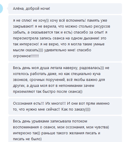 Мне очень радостно от этого, т.к. сильно переживала перед сеансом, что не смогу понять информацию и подведу Алёну, зря потратив её время.