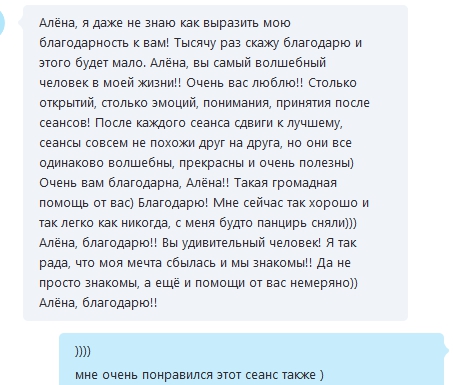 2. Работали со страхом темноты. И еще много с чем. На этом сеансе были слезы, причем не только у клиентки, но даже 2 раза у меня. Некоторые фрагменты настолько трогательные, что я считываю из поля клиента буквально все. Мы находились с клиенткой в полном «контакте бессознательных».